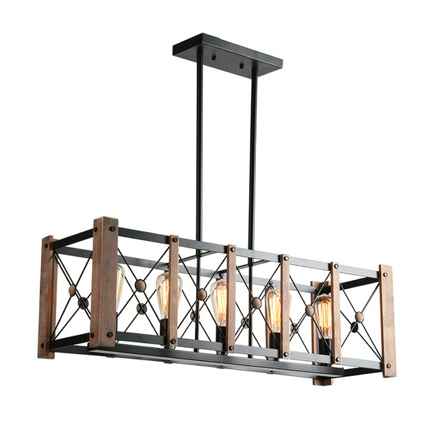 Industrial island ceiling light fixture adjustable height,6-light vintage linear ceiling lamp with natural wood for home decor.